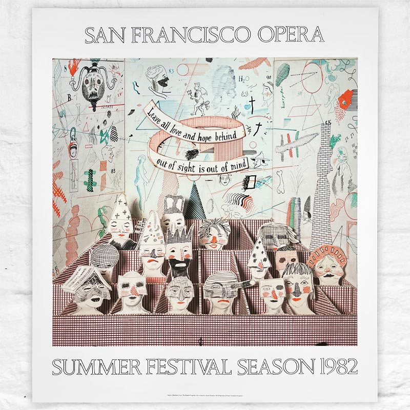 This stunning large poster, showing David Hockney's design for the Bedlam scene in Stravinsky's The Rake's Progress, was created in 1982 for the San Francisco Opera Summer Festival Season.
