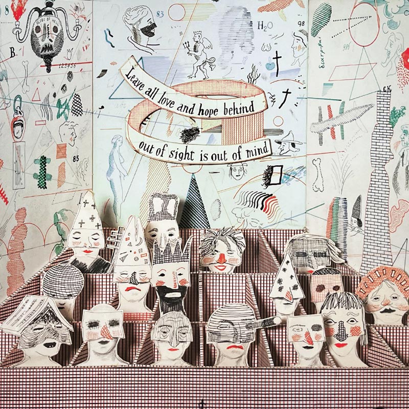 Hockney's 1975 designs for The Rake's Progress became some of the most important theatre design of the twentieth century - thrilling and immersive. This poster gives you a glimpse of the magic created on stage. The libretto was written by W.H. Auden and Chester Kallman. Hockney celebrates their brilliance, placing their words centre stage for this final scene in Bedlam, an institution for the poor and insane: 'Leave all love and hope behind / Out of sight is out of mind.'
