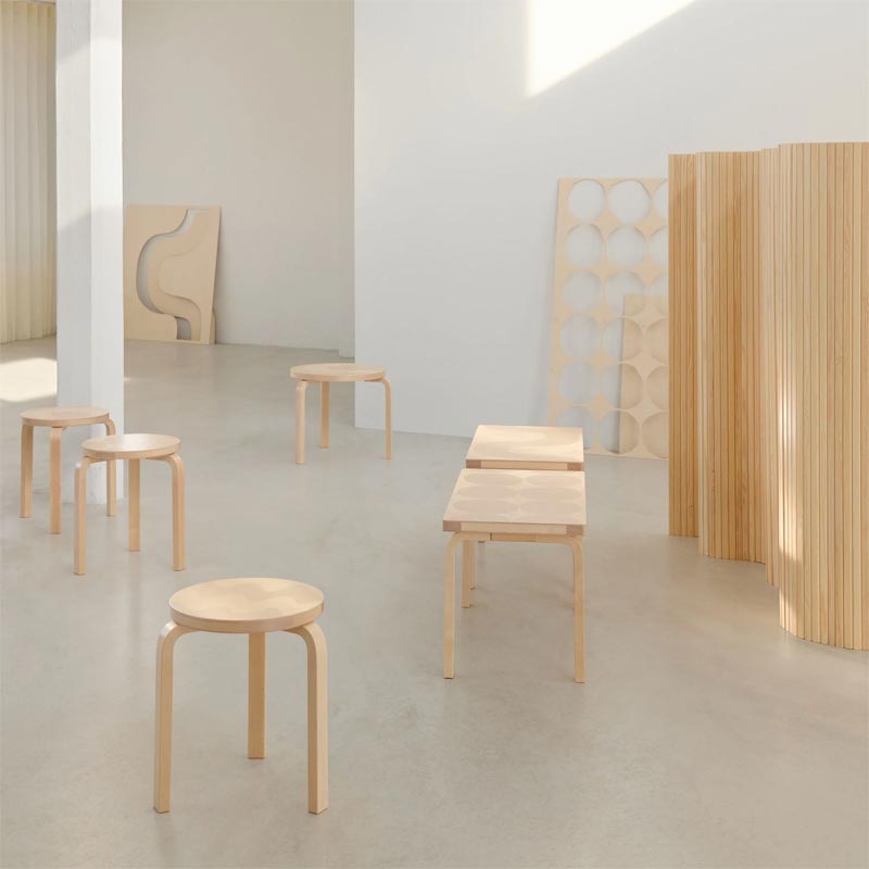 As part of its 90th anniversary festivities, Artek has joined forces with Finnish design house Marimekko to present a limited furniture collection. This collaborative collection merges Marimekko’s art of printmaking and Artek’s technology of wood bending.