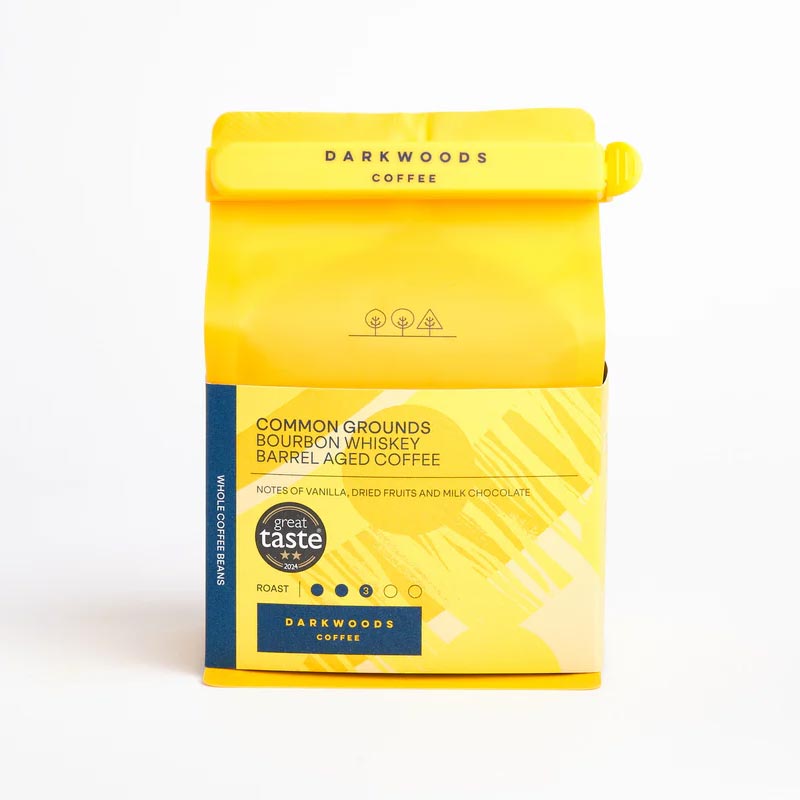 Common Grounds is a striking and innovative collaboration with Huddersfield craft brewer Magic Rock. Utilising Woodford Reserve Bourbon Barrels sourced from the brewery, Darkwoods explored the idea of resting green coffee in these used barrels before roasting, in the same way that the brewery ages some of its beers.