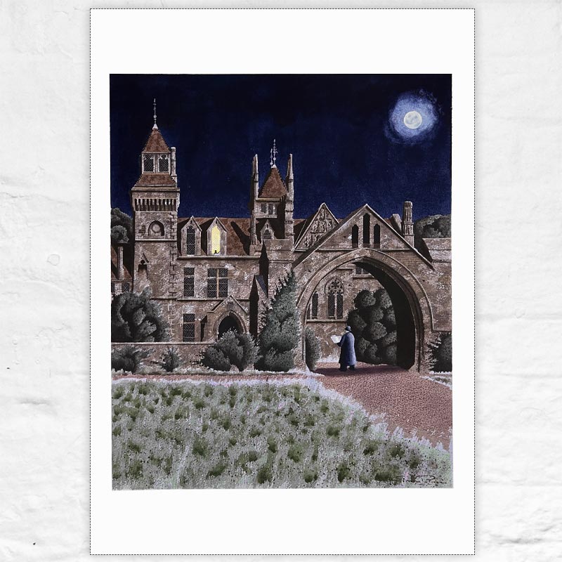 This is a poster of Simon Palmer's evocative moonlit image of Milner Field, the grand Victorian mansion built by Titus Salt Jr, son of Saltaire founder Sir Titus Salt. The image was originally created by Simon as part of his 'Saltaire: a Picture Story Book.'